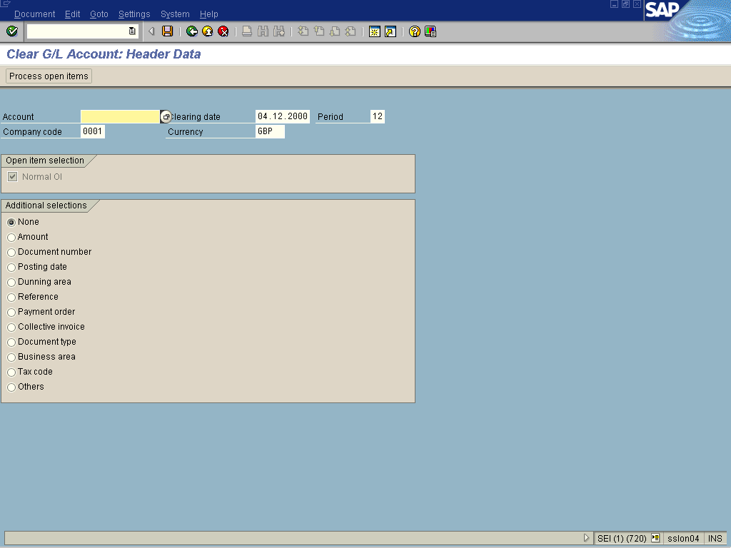 Clear G/L Account: Header Data