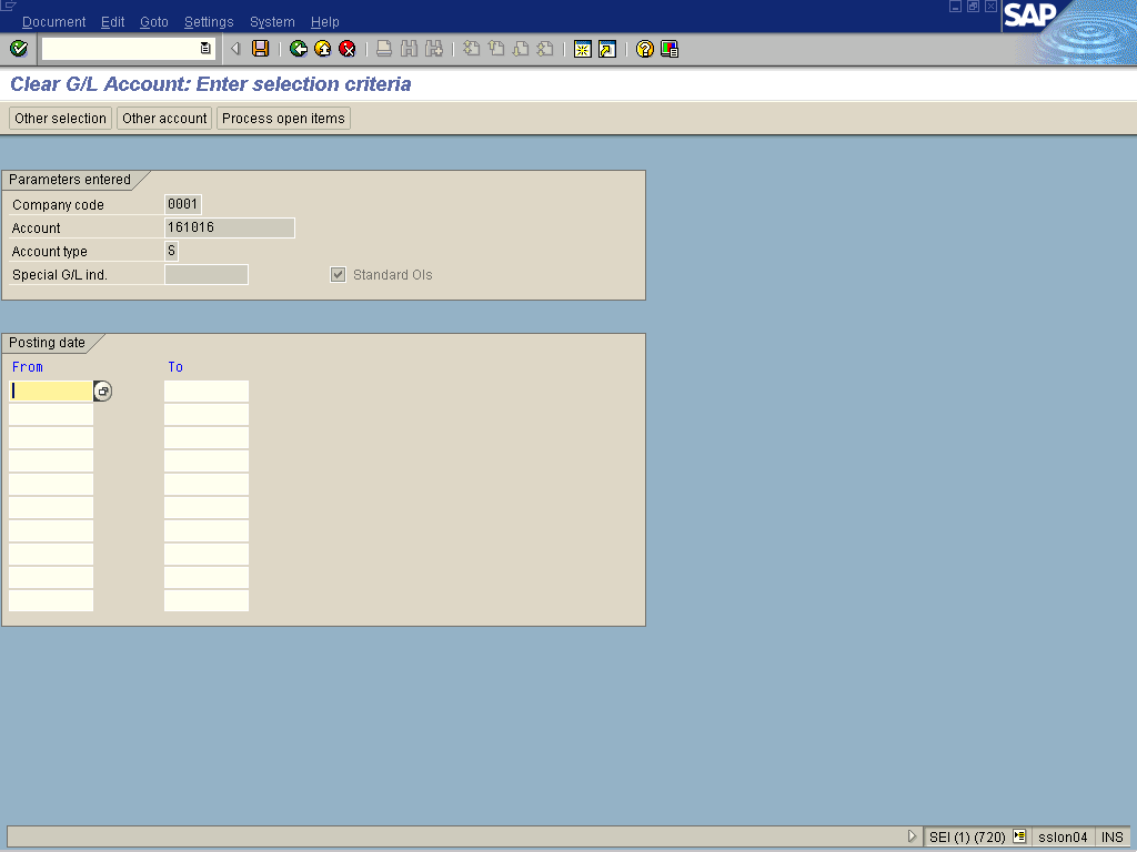 Clear G/L Account: Enter selection criteria