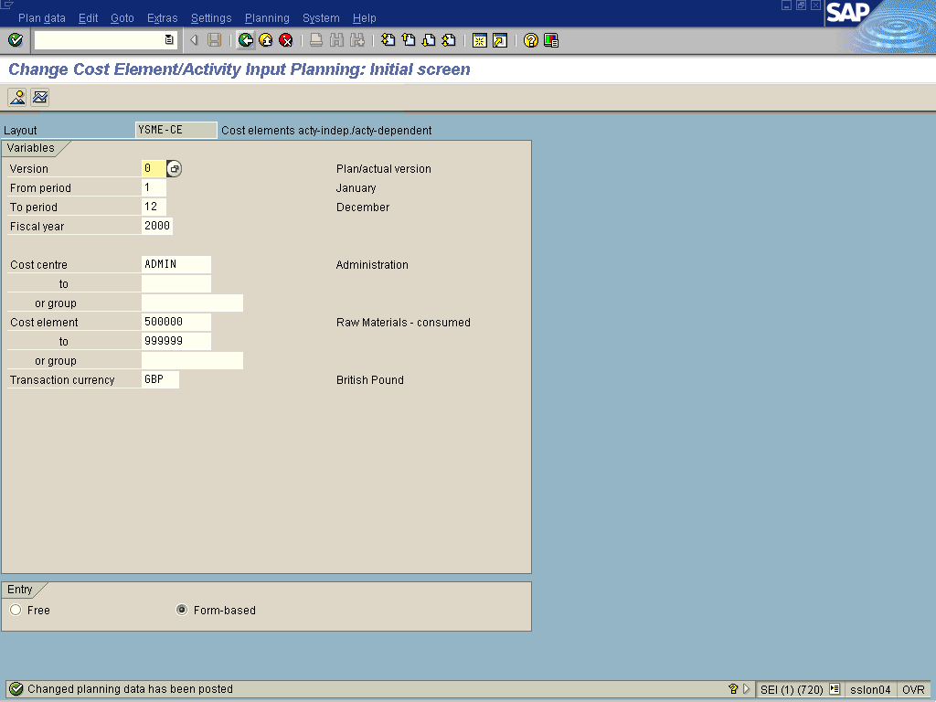 Change Cost Element/Activity Input Planning: Initial screen